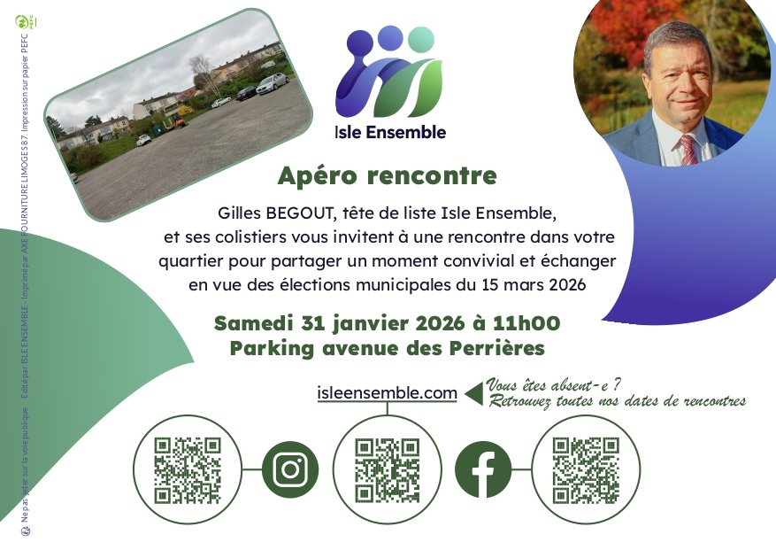 La liste ISLE ENSEMBLE, conduite par Gilles BEGOUT, lance ses rencontres de quartiers et vous invite à un premier apéro rencontre au plus près des habitantes et habitants.