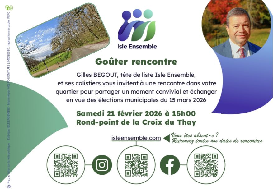 La liste ISLE ENSEMBLE, avec Gilles BEGOUT, vous donne rendez-vous pour un goûter rencontre placé sous le signe de la convivialité et de l’échange.